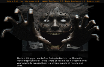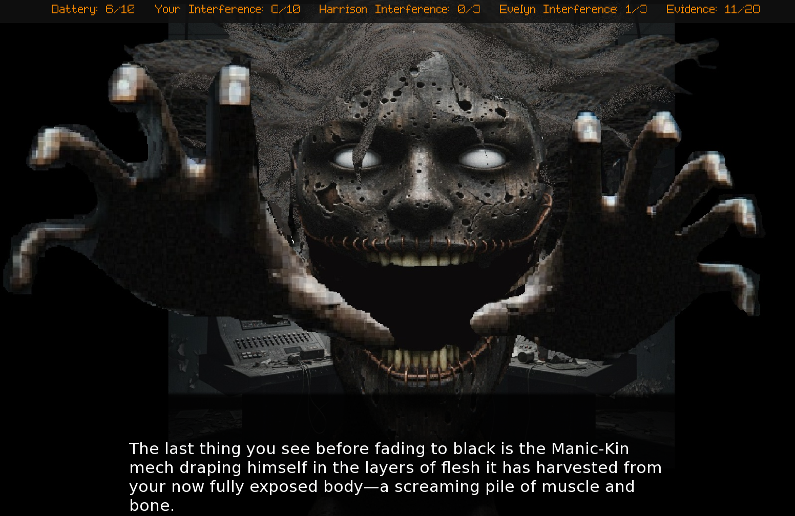 - Corruption Check: Monitor your own Signal Interference, as well as the rising corruption levels in Harrison and Evelyn. Every aggressive choice or exposure point pushes them closer to a violent, final fusion and one of five possible Bad Endings.